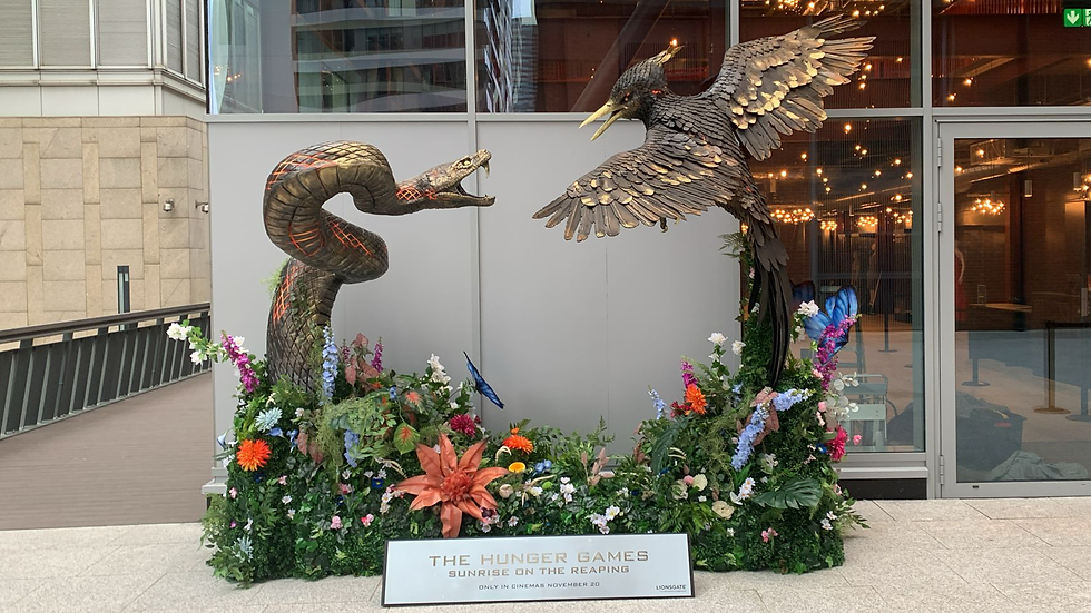 At the centre of the toolkit was a clear visual direction rooted in the film’s key iconography, with the intertwined Mockingjay and Snake forming the basis of every installation. Floral elements were integral, with guidance encouraging arrangements to feel organic, layered, and slightly wild, supported by a vibrant colour palette drawn from the original key art to maintain richness and contrast.